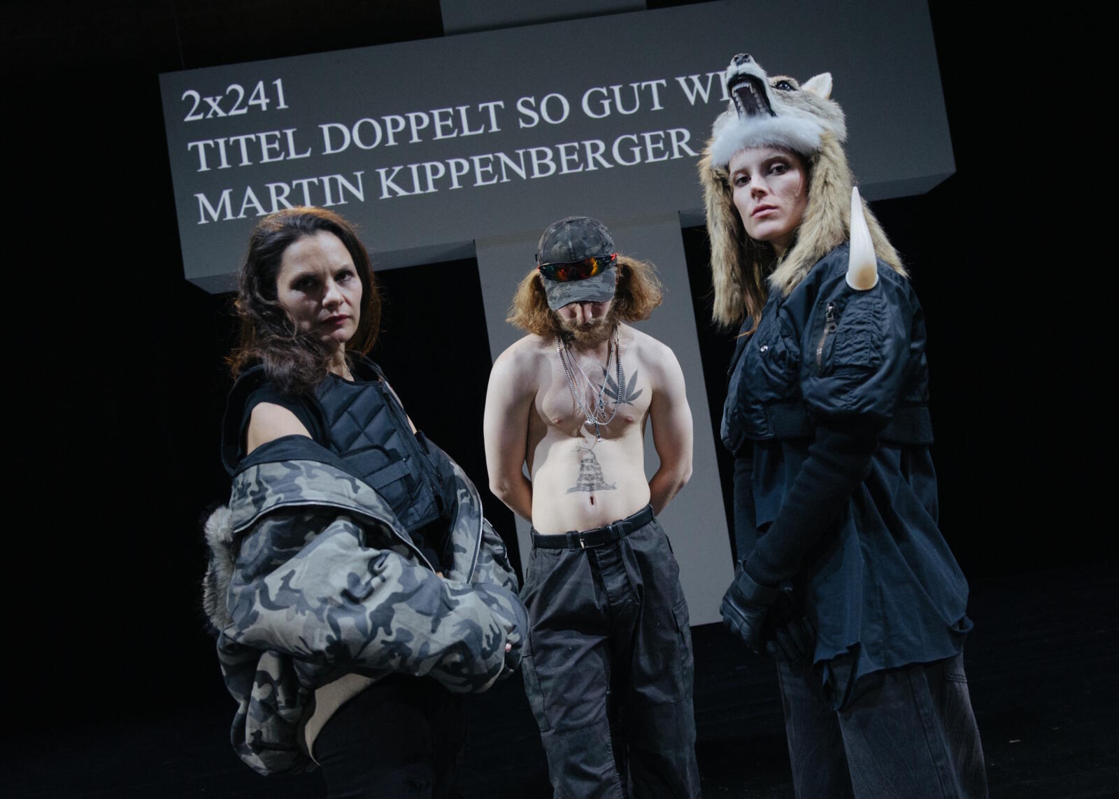 Das erste Theaterstück des Kunstkollektivs Frankfurter Hauptschule „2x241 Titel doppelt so gut wie Martin Kippenberger“ greift zwei ikonische Werke des Multikünstlers Kippenberger auf: Sein Buch „241 Bildtitel zum Ausleihen für Künstler“ und sein Gemälde „Ich kann beim besten Willen kein Hakenkreuz erkennen“ – ein Bild voller in sich verkeilter kreuzförmiger Flächen. Aus beiden Anregungen machen die Frankfurter mit Referenz an die genialen Blödeleien der Neuen Frankfurter Schule 482 mögliche Werktitel, meist Oneliner zwischen Wortspiellust, Kunst-Insiderei, Klassenclownprosa – und rechter Entgleisung. Es fängt ganz lustig an, bis die Witzischkeiten zunehmend aus dem Ruder laufen. Mit diesem Stück schließt das diesjährige Festival seine Saison ab.