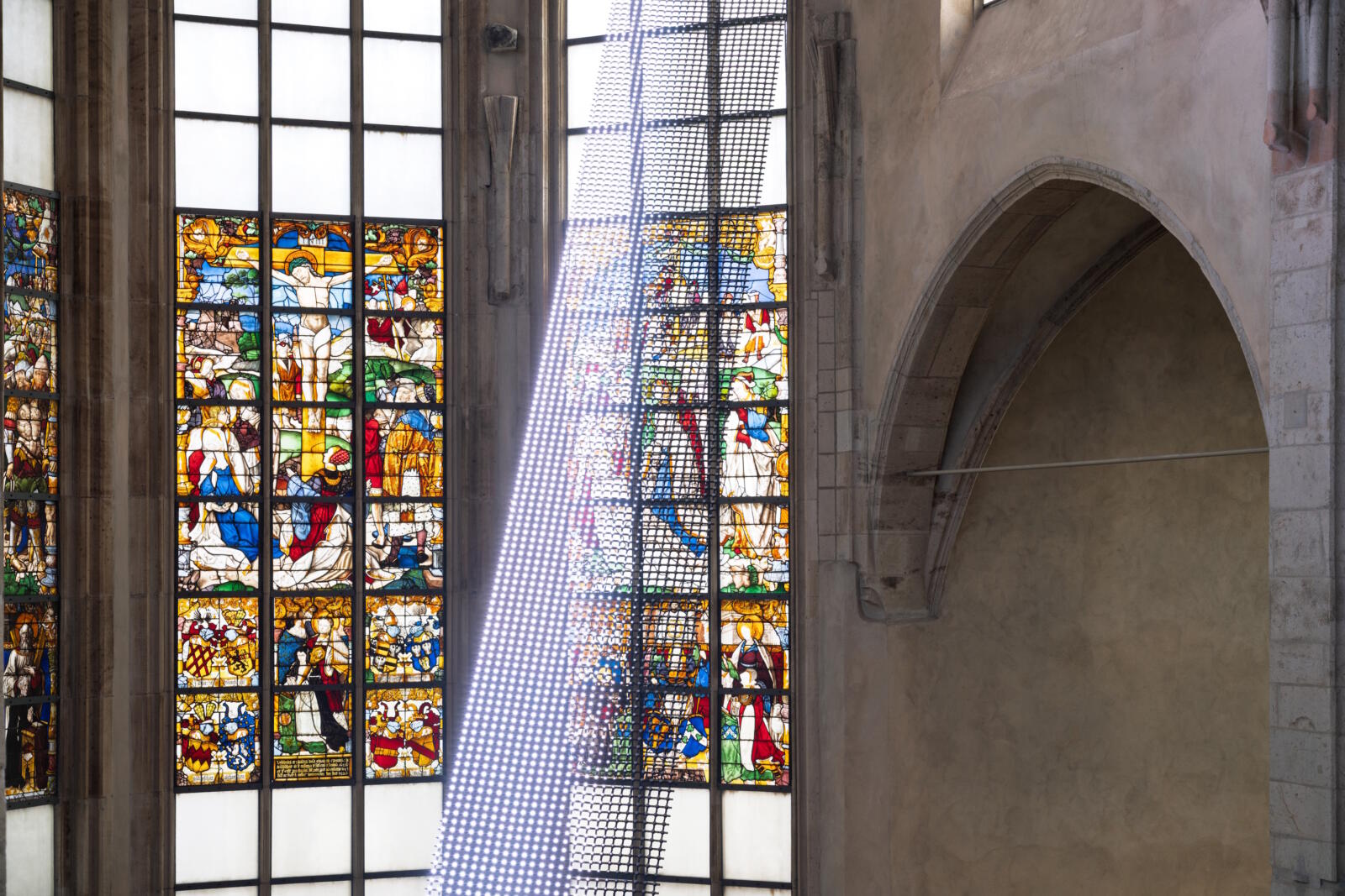 Bei näherer Betrachtung ist zu erkennen, dass die rund 20 Meter lange Installation aus einem halbtransparenten Netz aus LED-Lichtern besteht. Aus diesem Spezialgewebe für überdimensionale Bild und Videopräsentationen schafft Anna Sokolova eine minimalistische, genau gesetzte Skulptur, deren Helligkeit und technische Konturen in klarem Kontrast zur Kirchenarchitektur stehen.