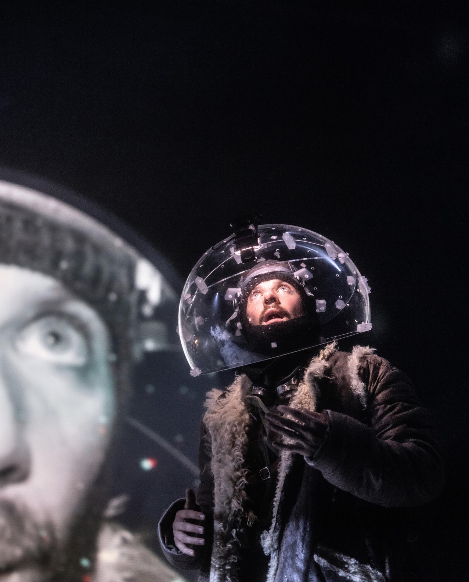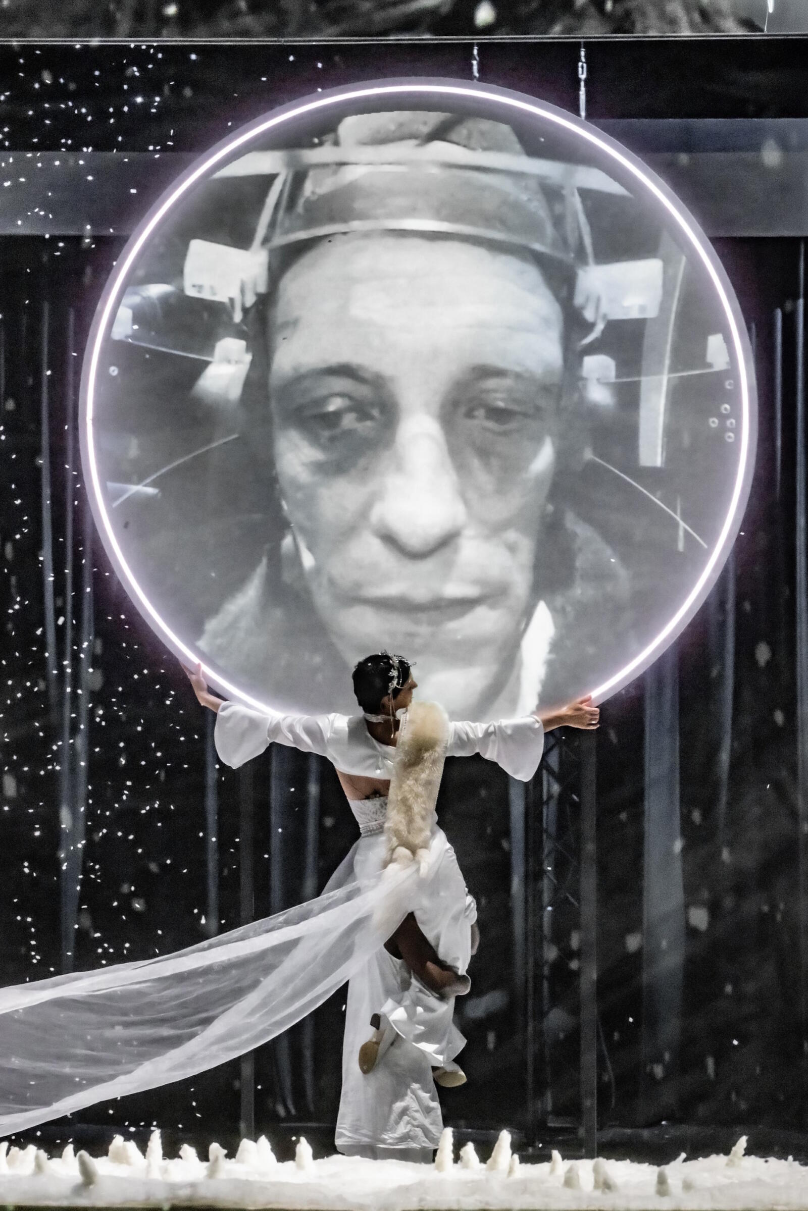 In Serebrennikovs Inszenierung wird der Schneesturm selbst zur dritten Hauptfigur. Mit einem Ensemble aus Schauspieler:innen und Musiker:innen, Tanz und Live-Projektionen verwandelt er Sorokins Text in ein ekstatisches Bühnenerlebnis – vielstimmig, verführerisch, verstörend. Inmitten eines rauschhaften Whiteouts entfaltet sich ein existenzielles Cabaret zwischen Märchen und Dystopie und führt das Publikum in einen sinnlichen Kontrollverlust.