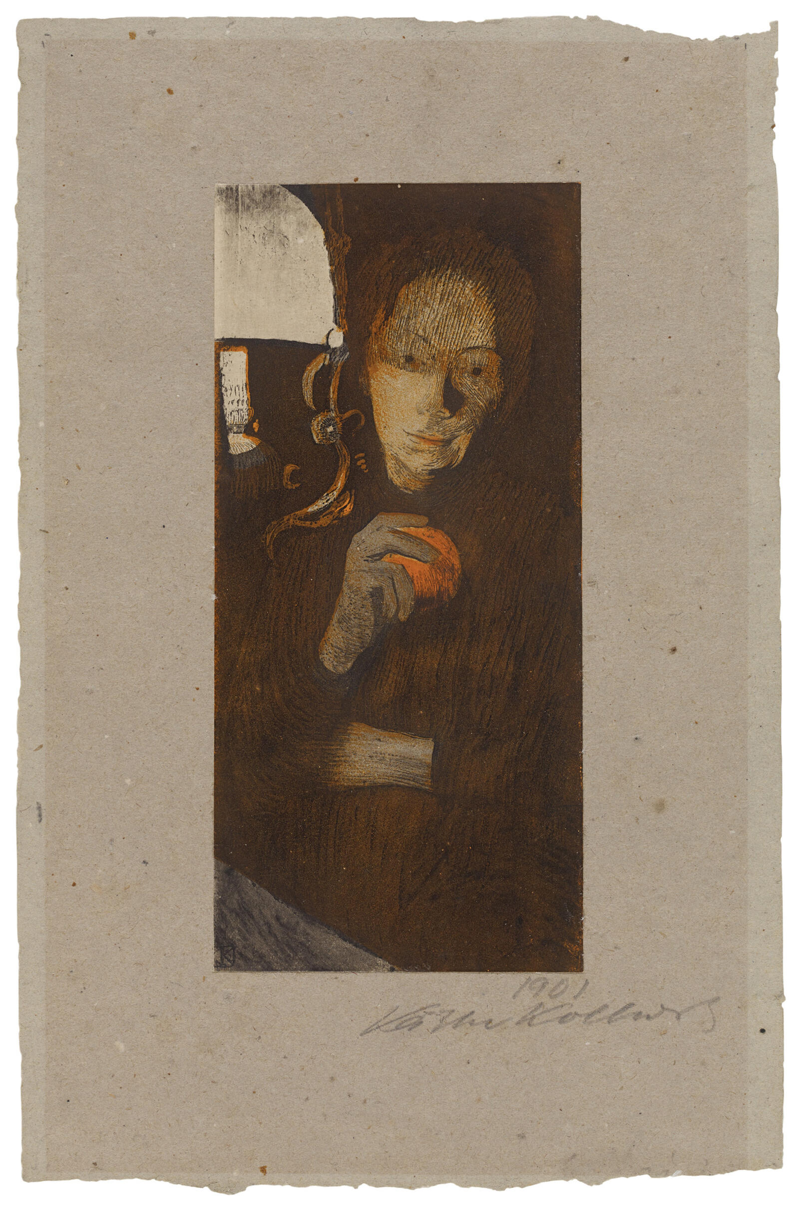 5. Käthe Kollwitz, (1867–1945), Frau mit Orange, 1901, Pinsellithografie mit orange eingefärbtem Tonstein und Radierung (Aquatinta, Reservage und Kaltnadel) mit Kohle etwas überarbeitet, auf cremefarbenem Papier, 231 x 112 mm, aufgelegt auf graues, löschblattartiges Papier, Kn 56 II 2, Käthe Kollwitz Museum Köln, Inv. Nr. 70300/97001