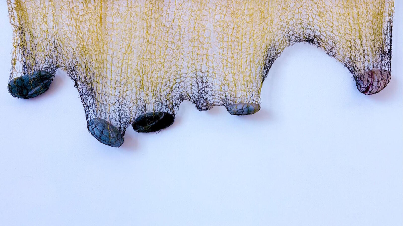 1. Veronika Moos, Zum Grund, 2025, Papiergarn, Kiesel, Itajime Färbung, 20 x 60 cm, courtesy the artist © the artist, Foto: Veronika Moos