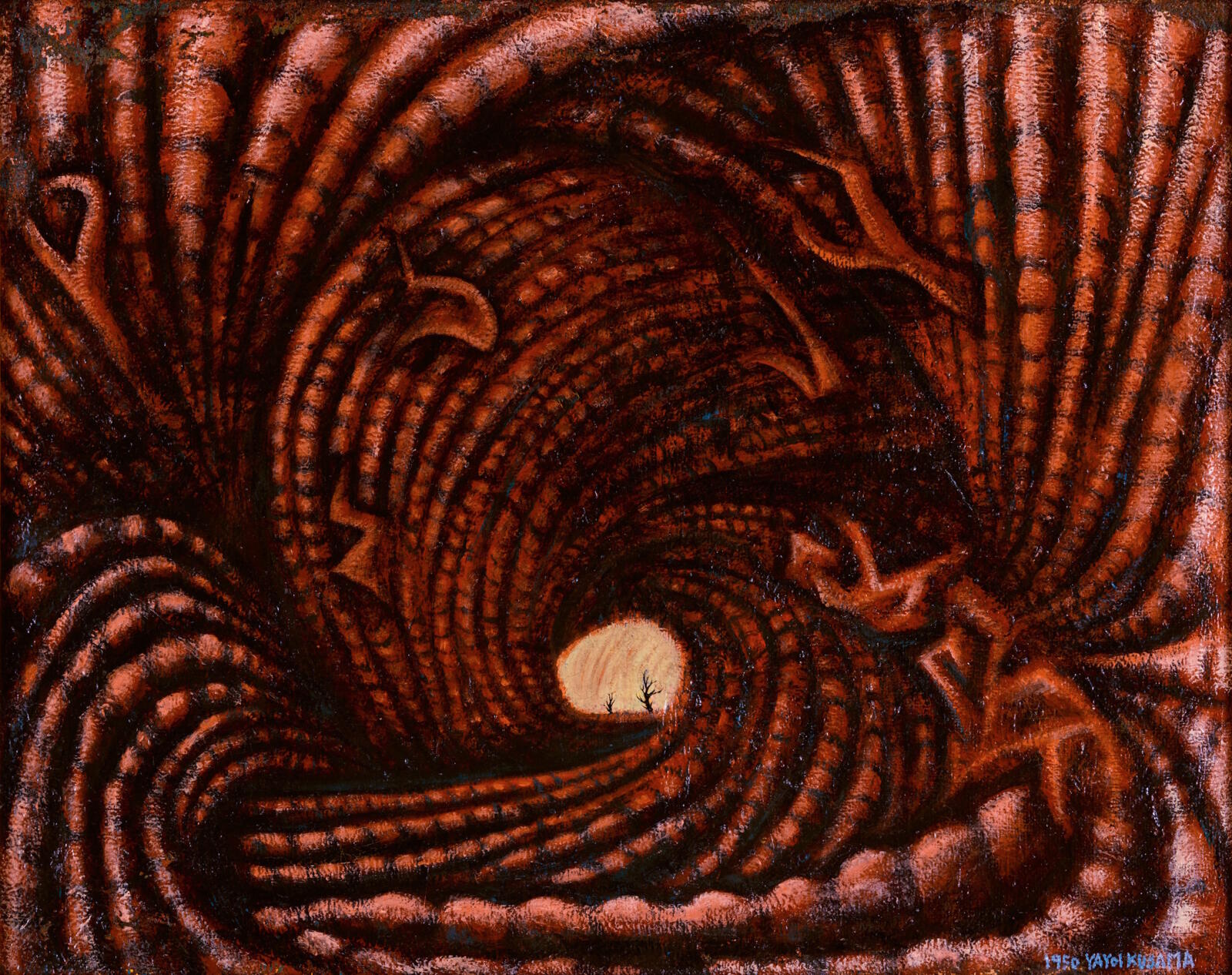 4. Yayoi Kusama "Accumulation of the Corpses (Prisoner Surrounded by the Curtain of Depersonalization)" 1950 Öl und Emailfarbe auf Saatgutsack, 72,3 x 91,5 cm, The National Museum of Modern Art, Tokio © YAYOI KUSAMA