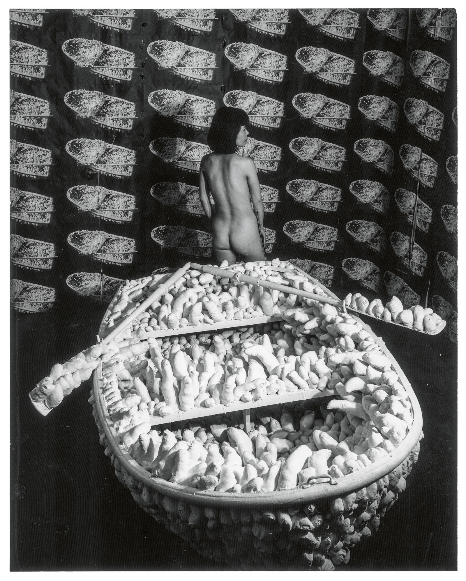 6. Yayoi Kusama in der Installation Aggregation: One Thousand Boats Show (1963), Gertrude Stein Gallery, New York, 1963 Fotografiert von Rudy Burckhardt © VG Bild-Kunst, Bonn 2025/Prolitteris, Zürich